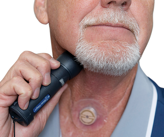 An electrolarynx creates a synthesized voice for those who have lost the capability to speak due to a damaged larynx.